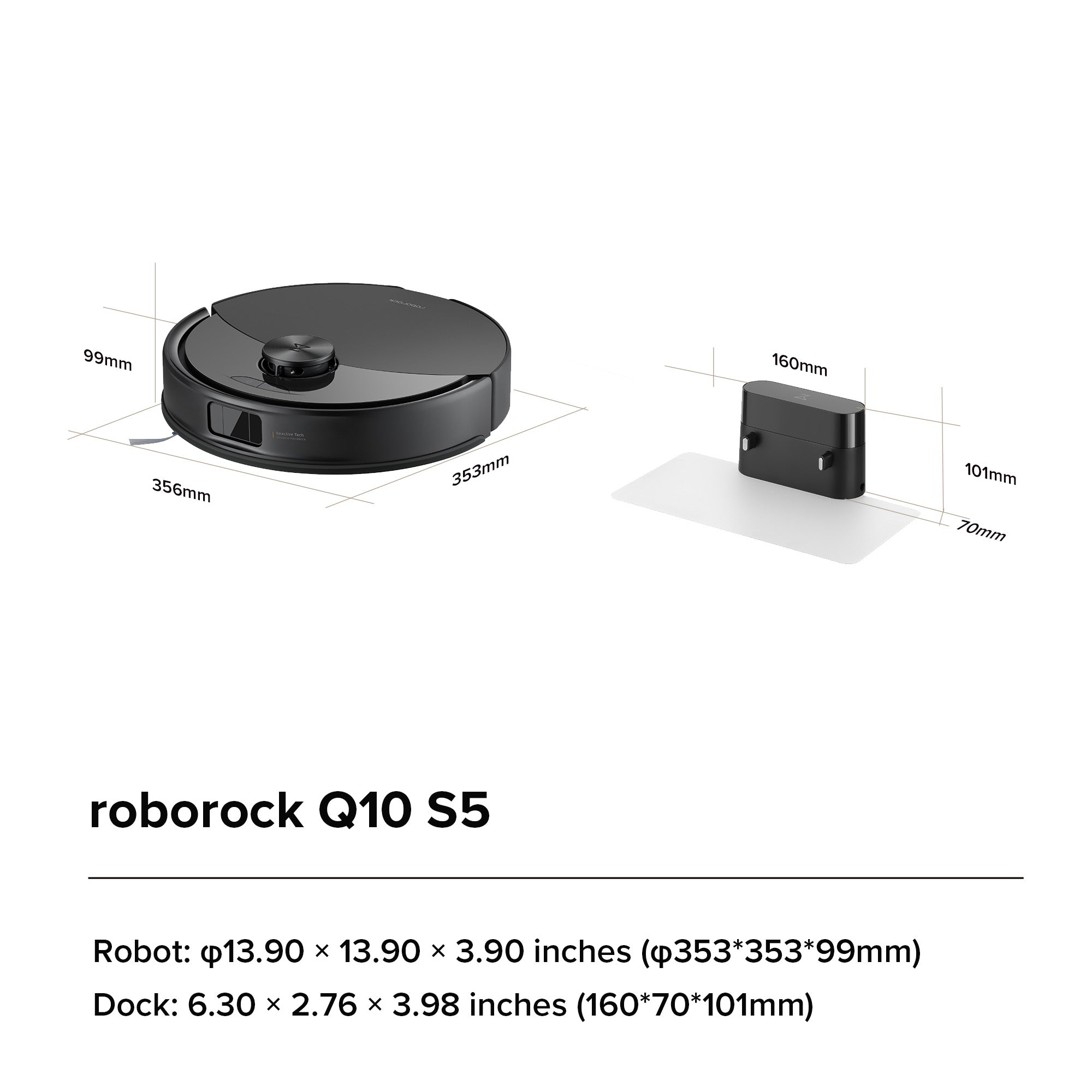 Dimensions: Robot Dimensions: 13.90 × 13.90 × 3.90 inches;Charging Dock Dimensions: 6.30 × 2.76 × 3.98 inches;Robot + Charging Dock Dimensions:16.14 × 13.90 × 3.98 inches