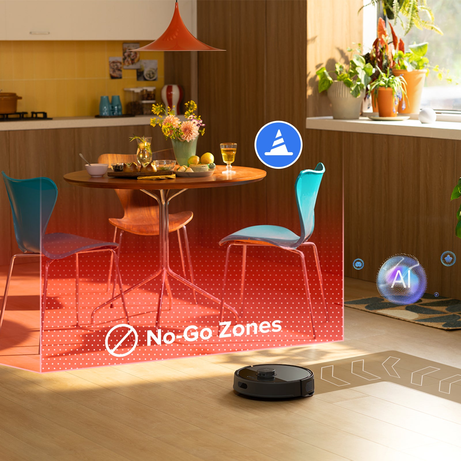 Avoid interruptions with smart navigation that detects tricky spots—like under chairs and tables—and automatically suggests No-Go Zones to keep cleaning seamless.