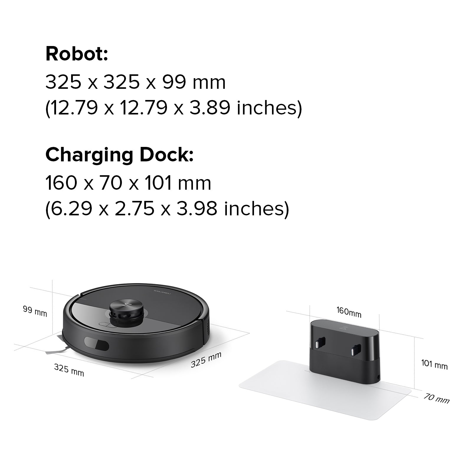 Robot Dimensions: 12.79 x 12.79 x 3.89 inches; Charging Dock: 6.29 x 2.75 x 3.98 inches