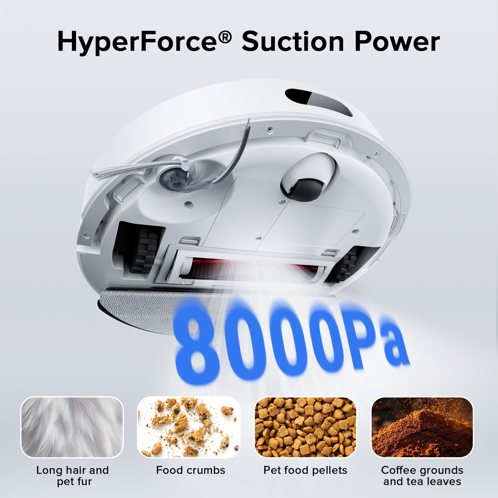 Unleash 8000 Pa* HyperForce® Suction for improved debris removal, delivering deeper, more powerful cleaning across various floor types.