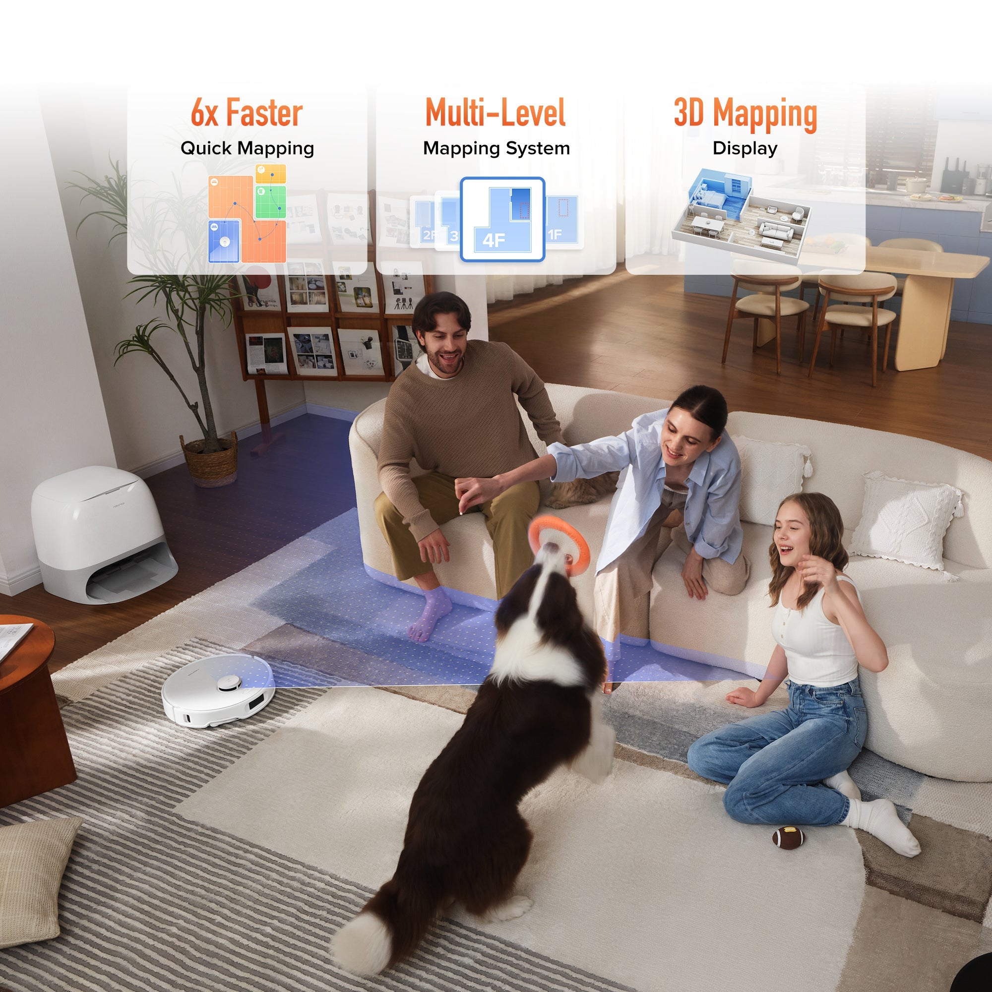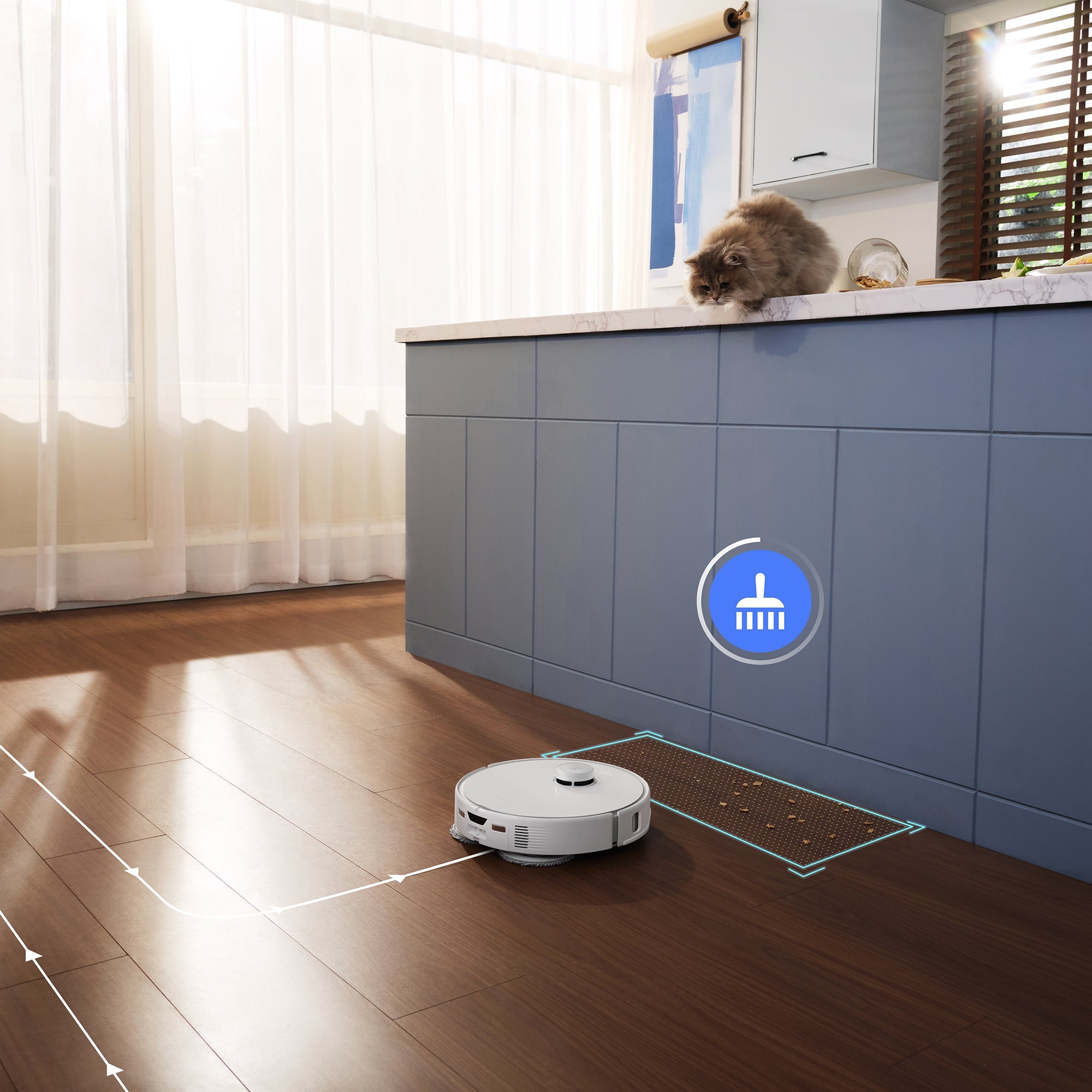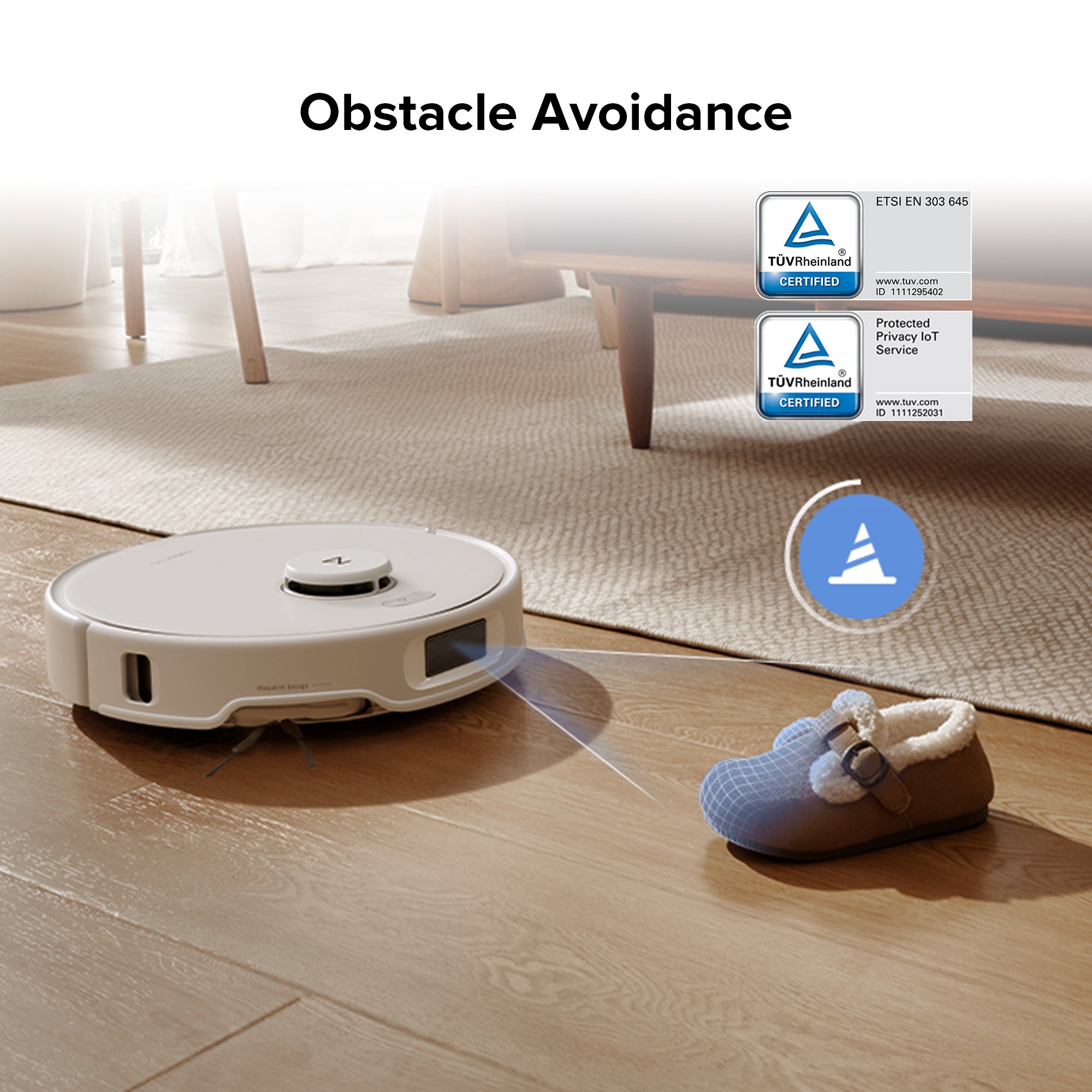 Using structured light to detect and steer clear of common obstacles, the robot ensures a smooth, worry-free cleaning experience—even without the need to clear the floor first.