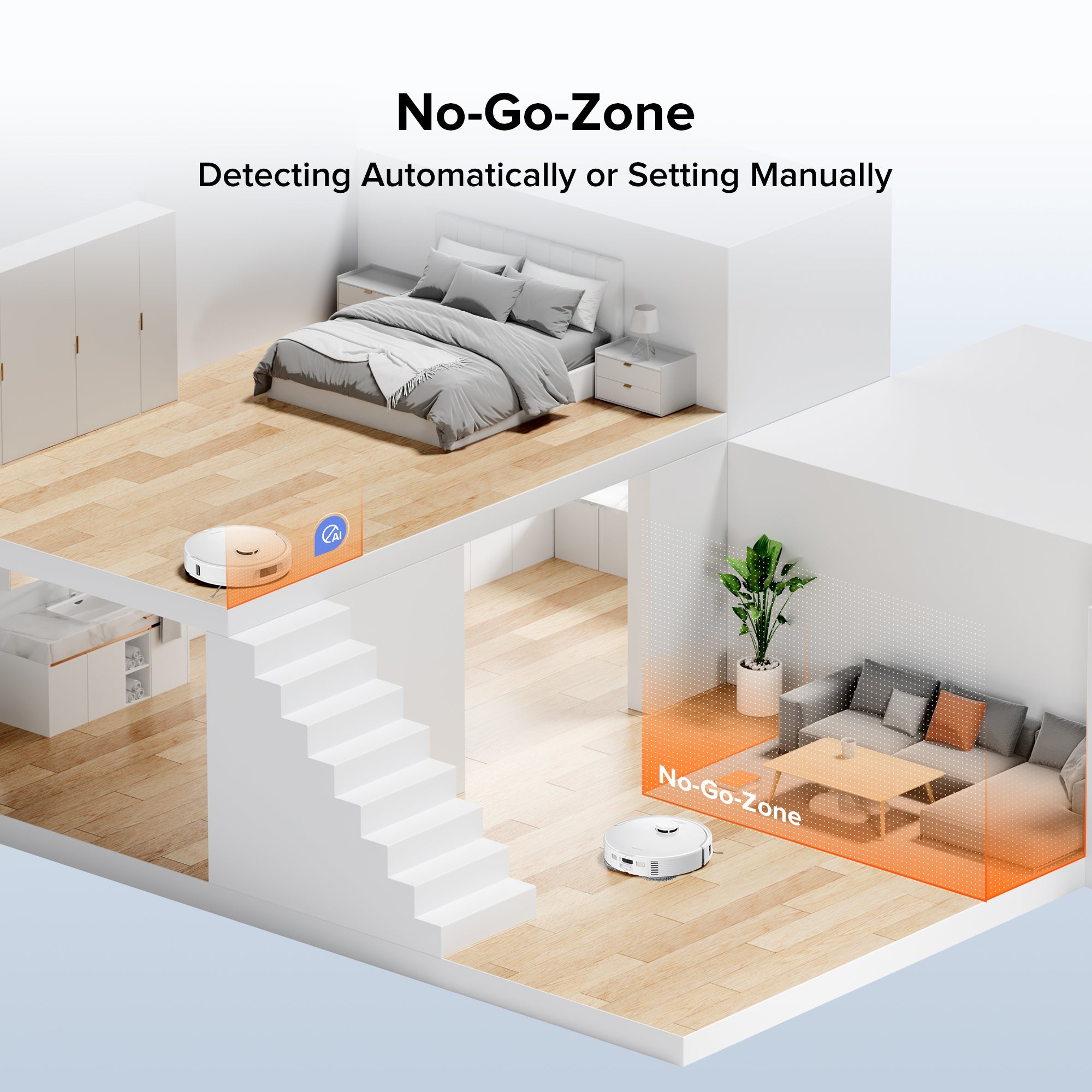 For stairs and easy-to-get-stuck places, the robot can detect and suggest them as 'No-Go Zones'.