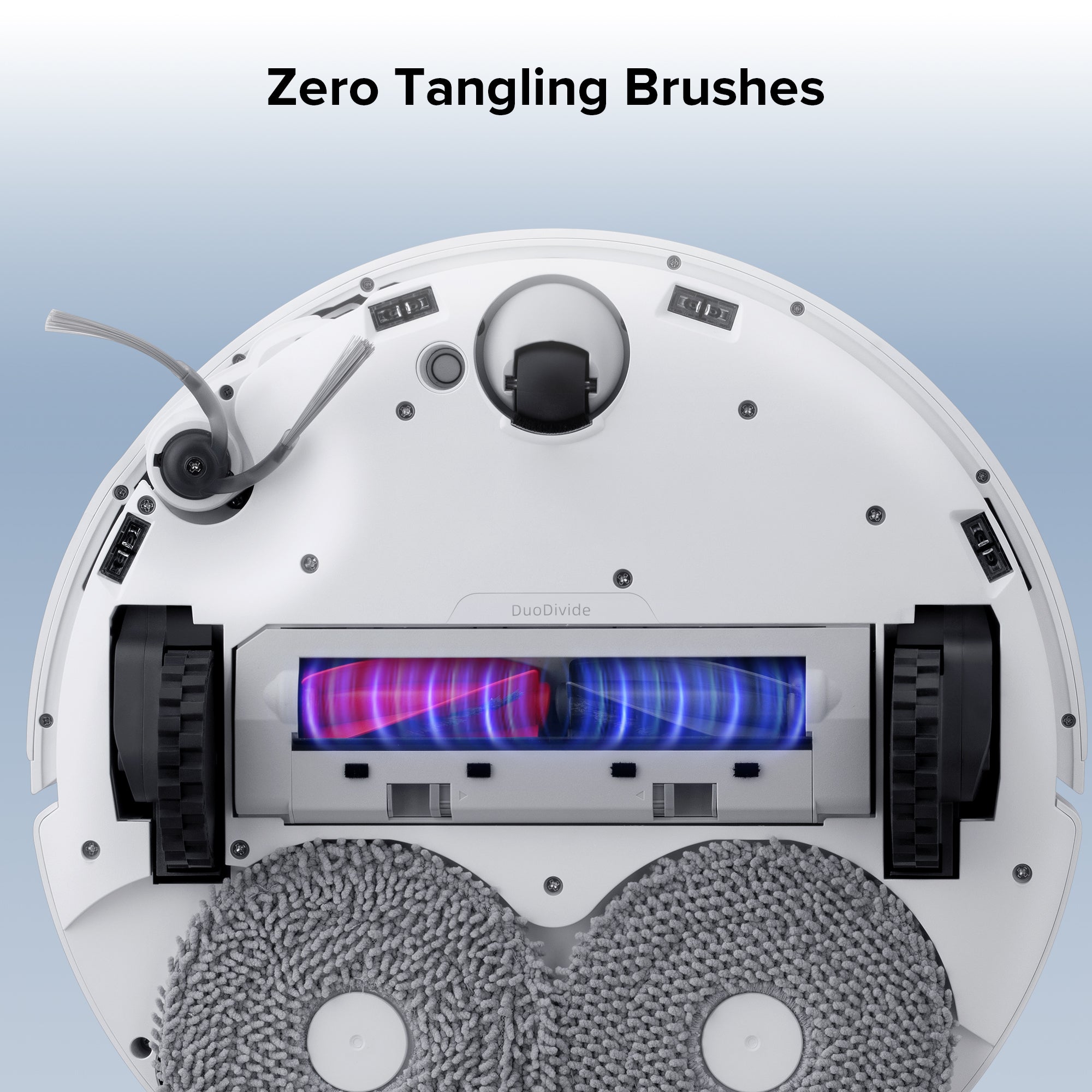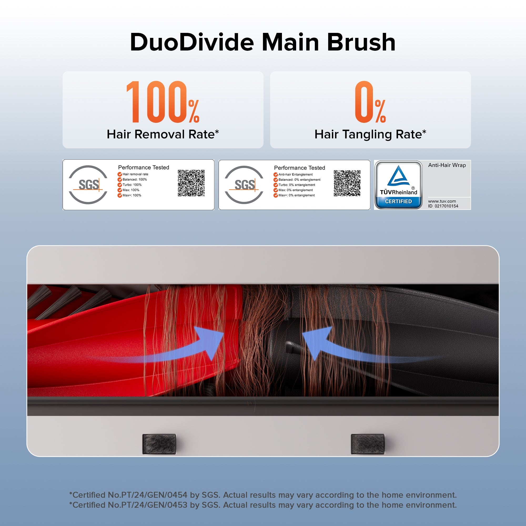 A: The DuoDivde brush is certified by SGS with 0% hair entanglement rate and 100% hair removal rate. It solves the problem of decreased cleaning efficiency caused by hair entanglement on the main brush and reduces the risk of main brush damage due to hair entanglement, making the robot vacuum cleaner more durable.