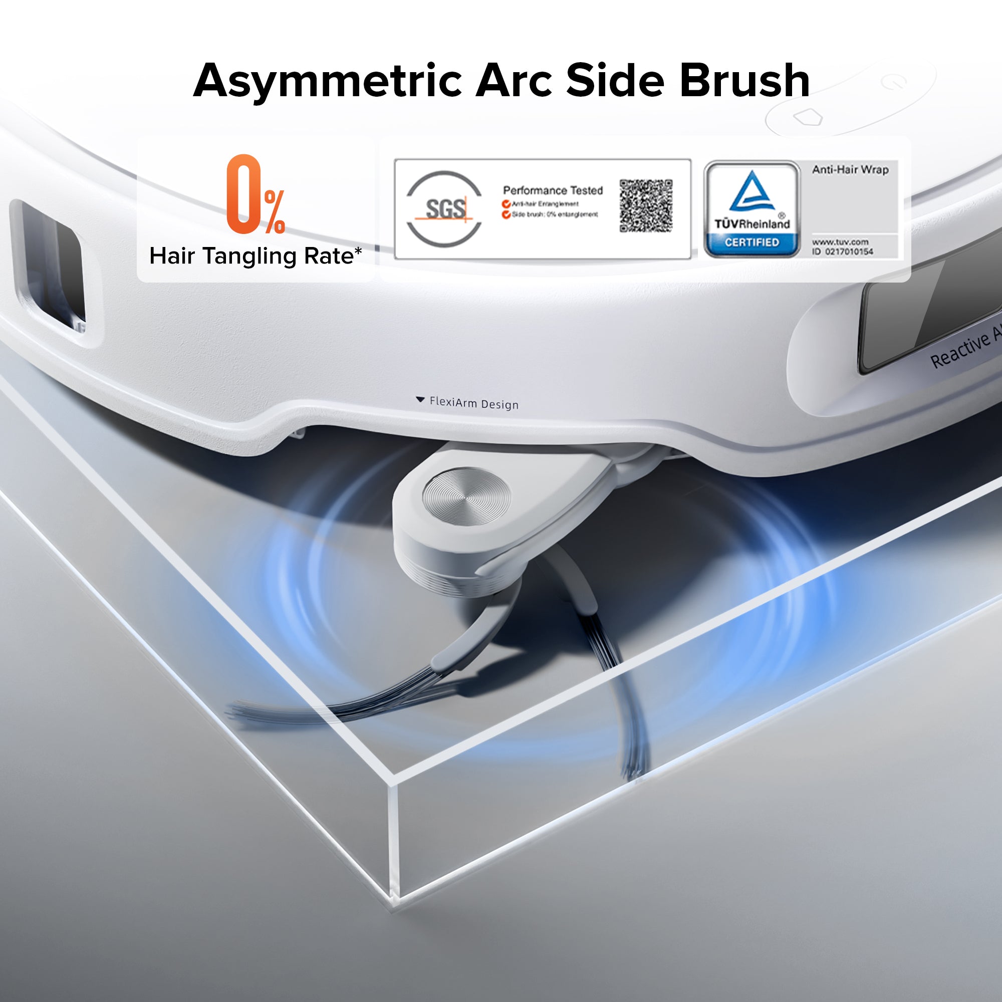 The unique arc-shaped asymmetric brush harnesses centrifugal force to prevent hair tangling, guiding it effortlessly to the bristle ends. SGS and TÜV certified, this design ensures efficient and tangle-free cleaning.